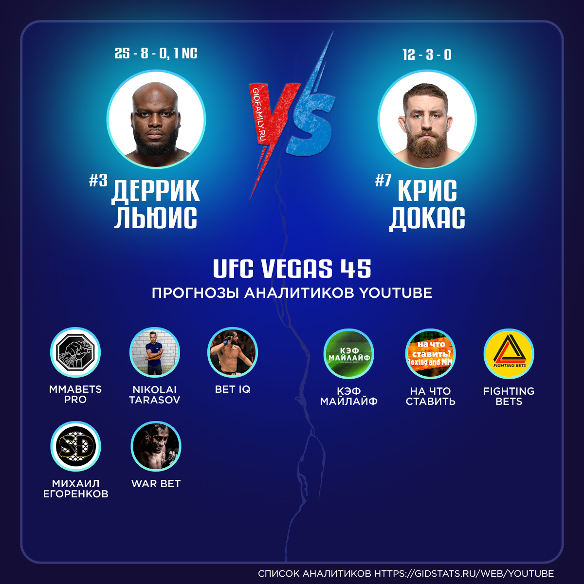Прогнозы отечественных аналитиков ММА YouTube на бой "Льюис - Докас" UFC Vegas 45. Мы просмотрели все прогнозы из списка аналитиков на этой странице.
