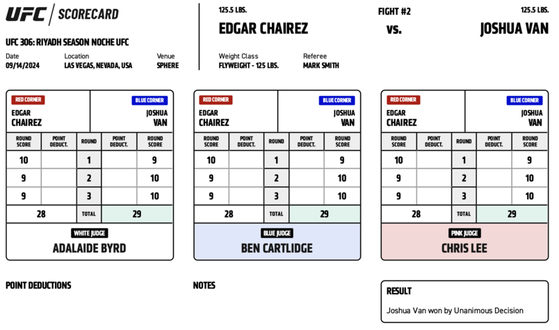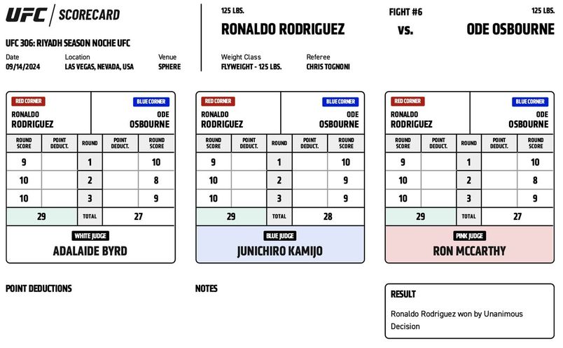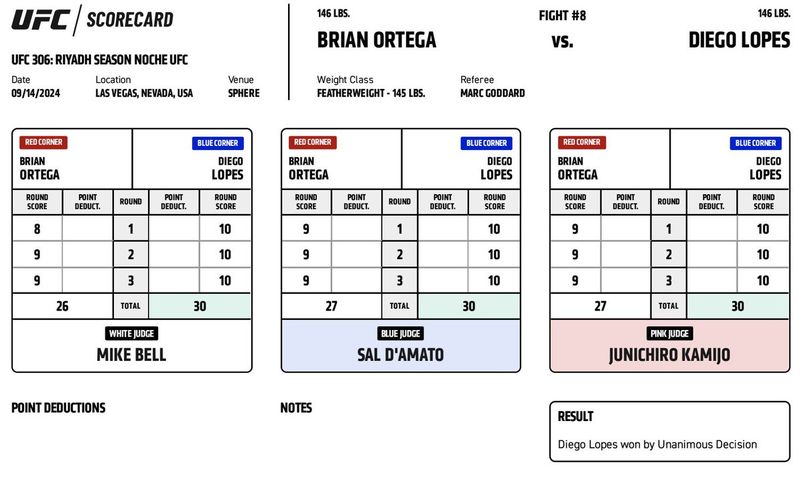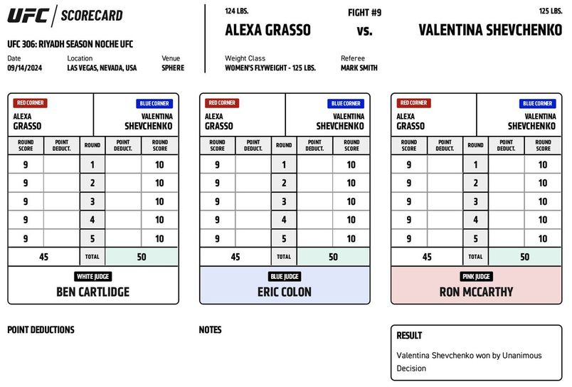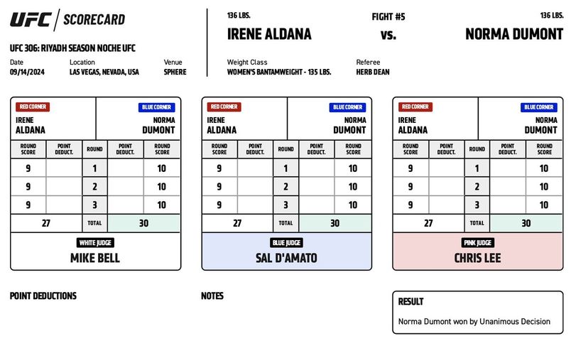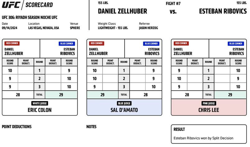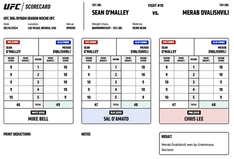 Официальные карточки судей за рингом UFC 306. На основе этих протоколов принимается решение о победителя боя.