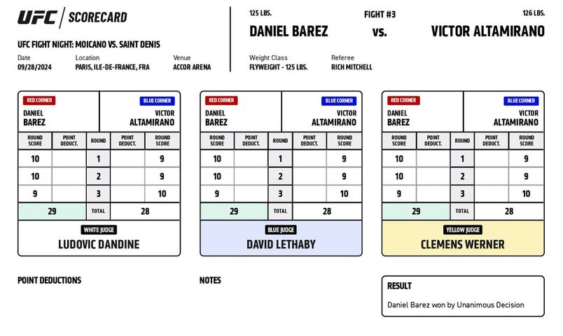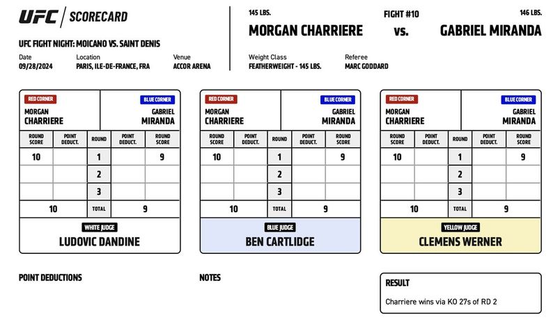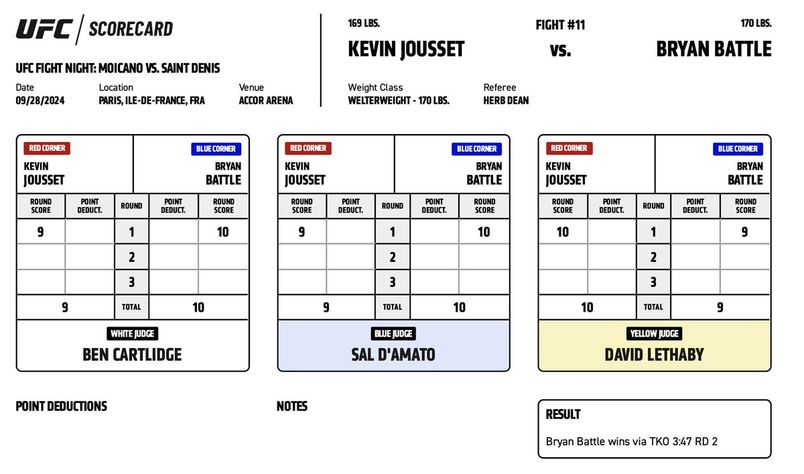 Официальные карточки судей за рингом ЮФС Париж. На основе этих протоколов принимается решение о победителя боя.